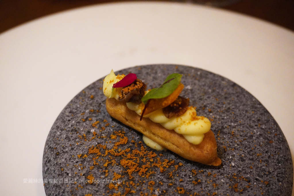 以烏魚子跟無花果乾搭配出鹹甜的豐富香氣,上方擠上絲滑馬鈴薯泥奶味十足