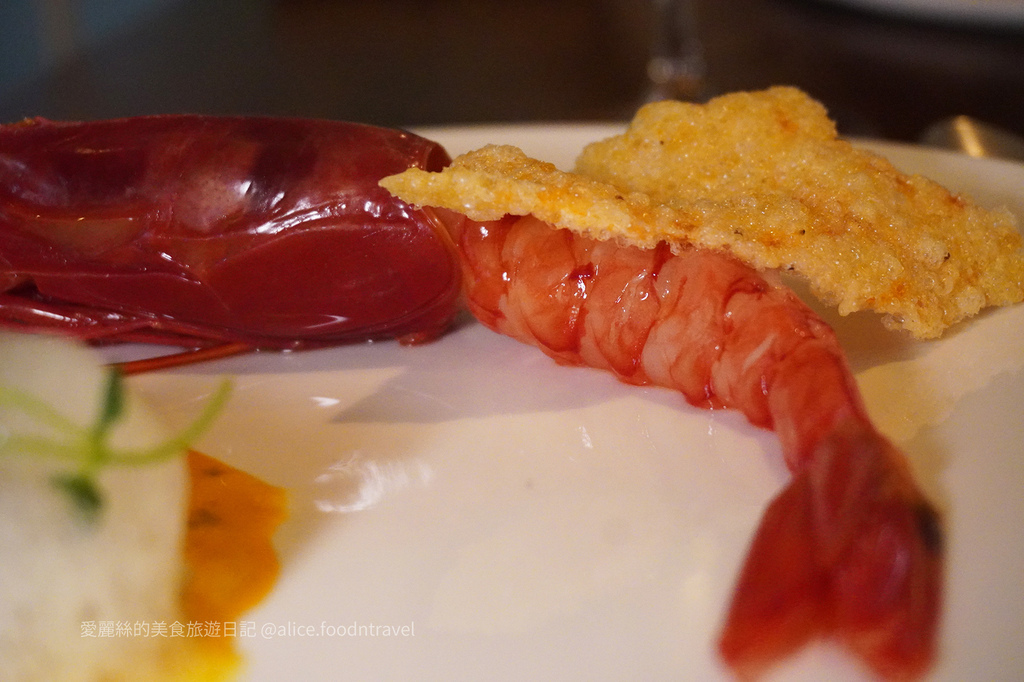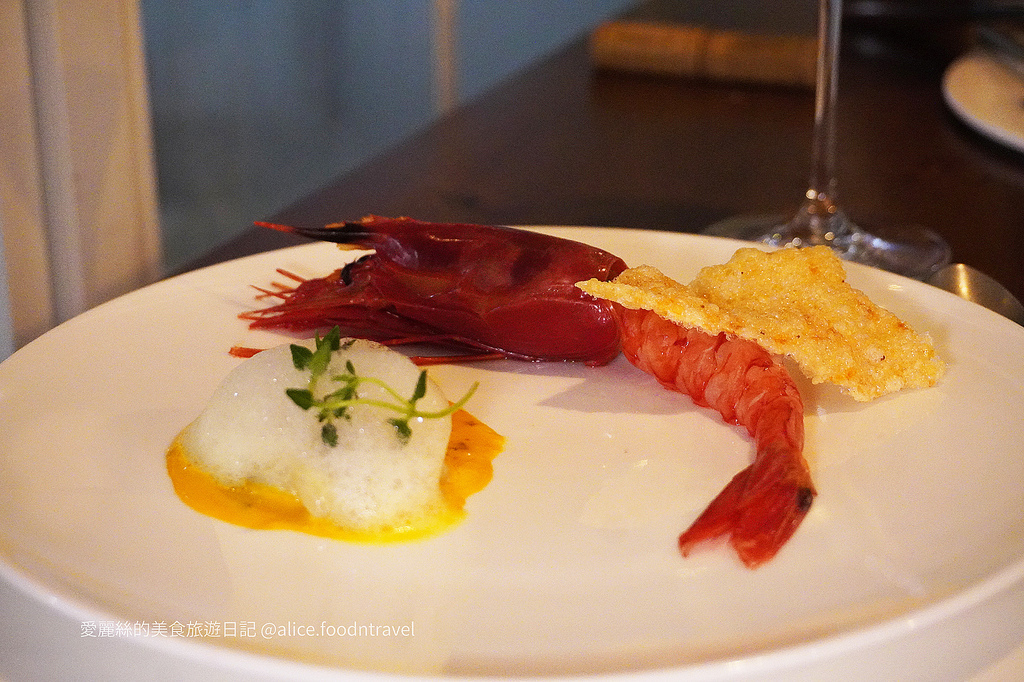 前菜選用宜蘭捕獲的生食級胭脂蝦一旁還有蝦膏跟番紅花所製成的沾醬