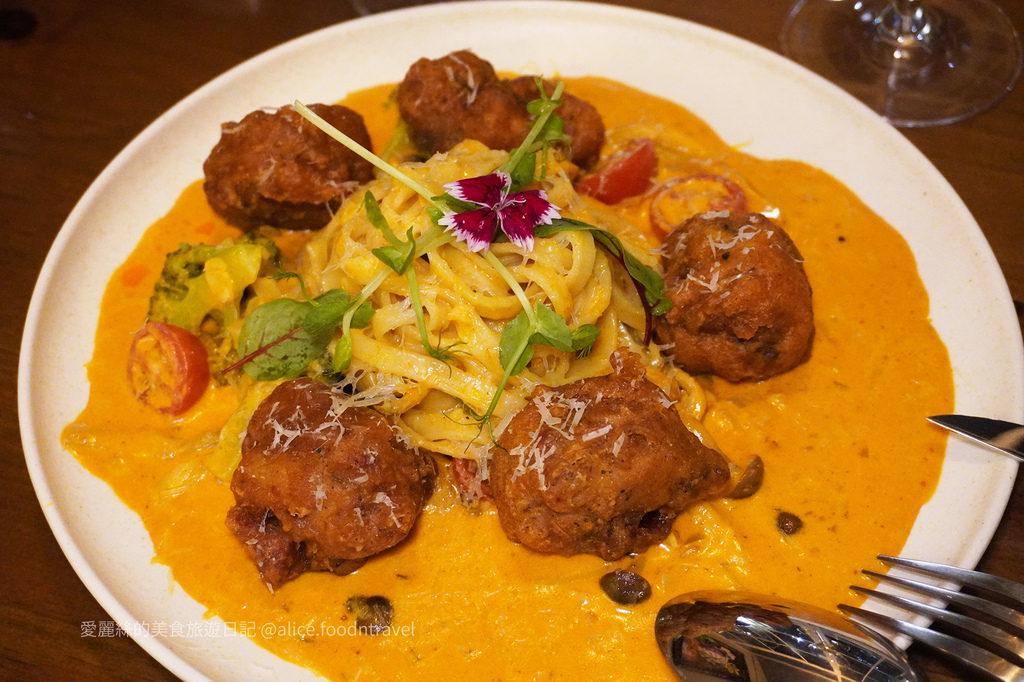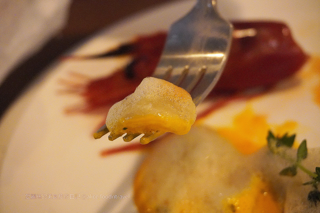 上方的泡泡是番紅花做成的,下方有一顆顆渾圓飽滿的馬鈴薯麵疙瘩,口感有點黏黏的,咬下會嚐到純粹澱粉香跟起司的味道。強烈推薦沾蝦膏醬一起吃~