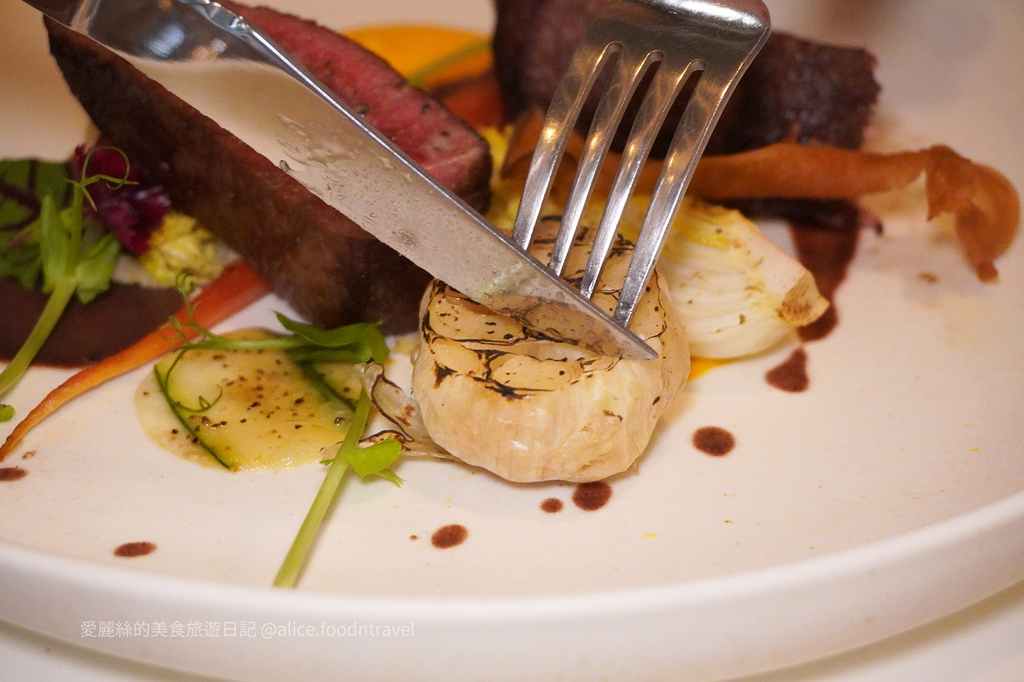美國菲力牛排旁邊搭配南瓜泥與紅酒醬、一整顆烤大蒜與烤蔬菜