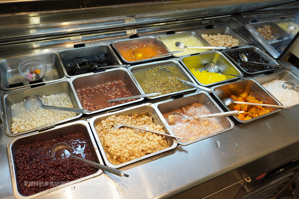 看起來Q彈有勁的粉圓、滑嫩的愛玉、富有嚼感的椰果、還有各式豆類像是大豆、紅豆、綠豆、薏仁,一字排開所有配料都晶瑩剔透,十分吸引人呢。