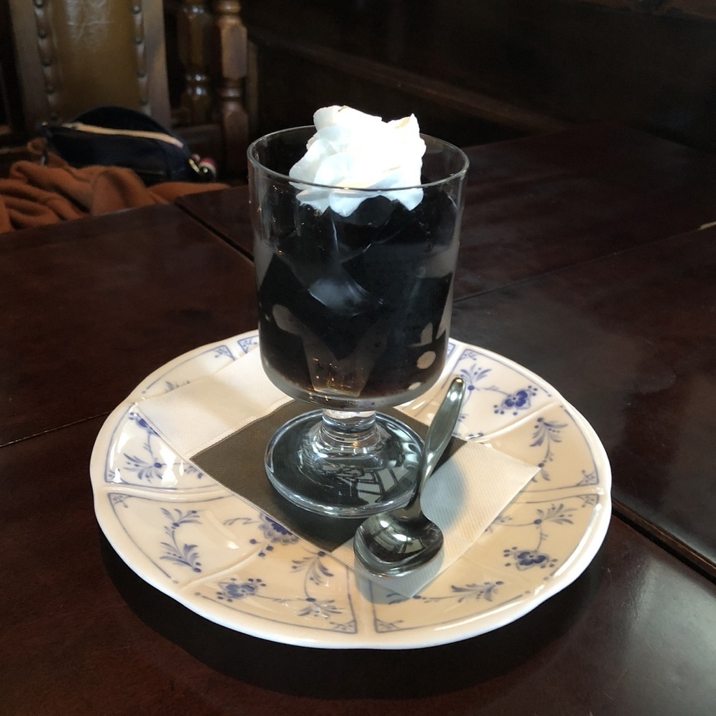 點了一份「 cafeゼリー 」也就是咖啡凍,因為那陣子看齊木楠雄的災難,整個被洗腦到很想吃咖啡凍哈哈哈,於是就在日本體驗看看到地的「 cafeゼリー 」,不會太甜,搭配上面鮮奶油很搭~在台灣很少看到這種甜點,但日本咖啡廳似乎很常見!歐式的杯盤也讓人充滿儀式感!